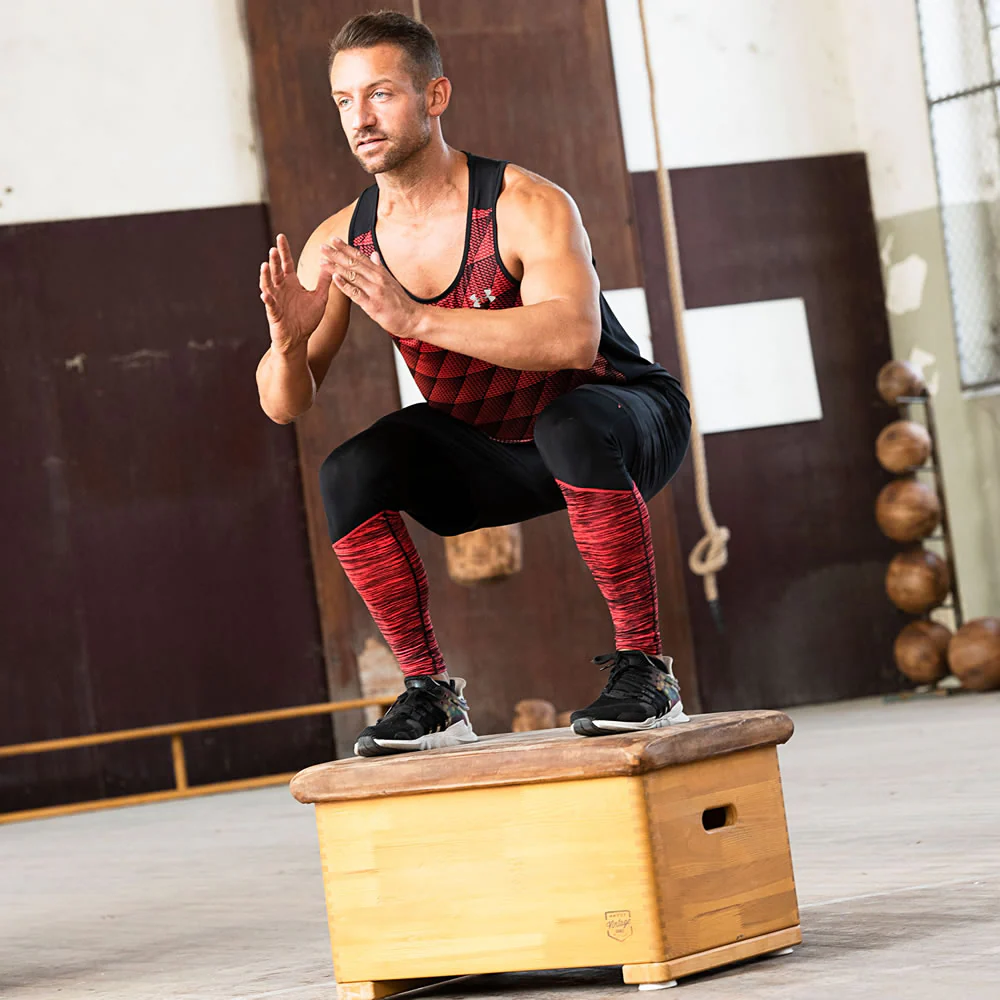 Der Sprungkasten Plus kann im Gegensatz zum normalen Sprungkasten aufgeklappt werden. Durch den eingezogenen Innenboden knnen Sie so jede Menge Fitnesstools im Sprungkasten verstauen.