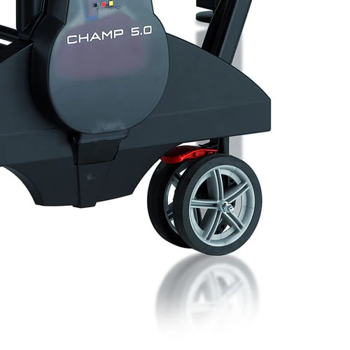 Das festinstallierte Netz verfügt über eine Hhenverstellung und eine automatische Spannvorrichtung. Dies, der Klappmechanismus und das Plattenführungssystem mit doppelter Transportsicherung ermglichen ein sicheres und schnelles Auf- und Abbauen der Tischtennisplatte Champ 5.0 Outdoor von Kettler. Mit Hilfe der vier lenkbaren Doppelrder mit Gummierung und einer Durchfahrtshhe von lediglich 165 cm kann die Champ 5.0 Outdoor schnell auf Seite gerumt werden. Ein Wegrollen der hochgestellten TT-Platte verhindern die zwei diagonal angeordneten Sicherheitsbremsen.