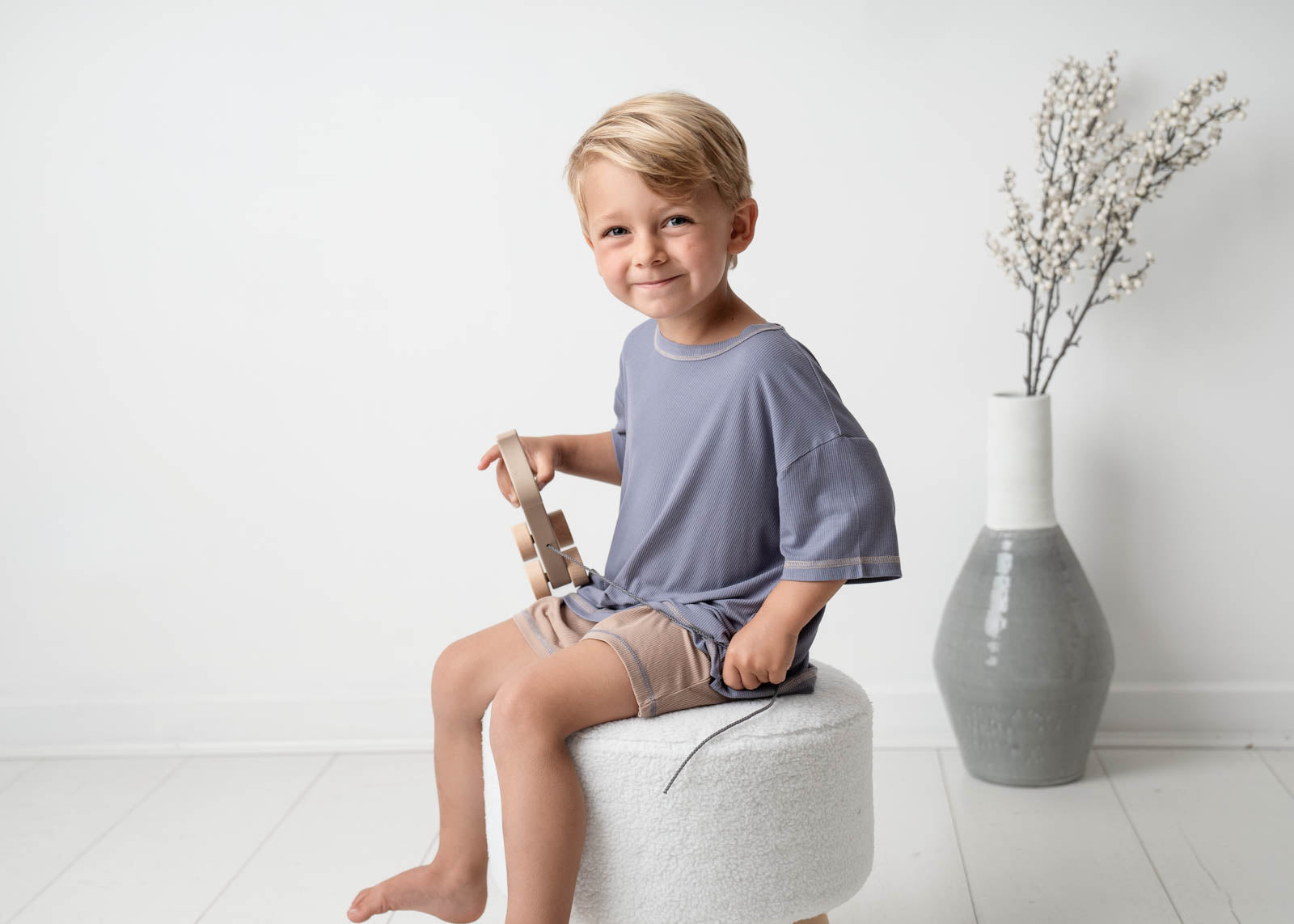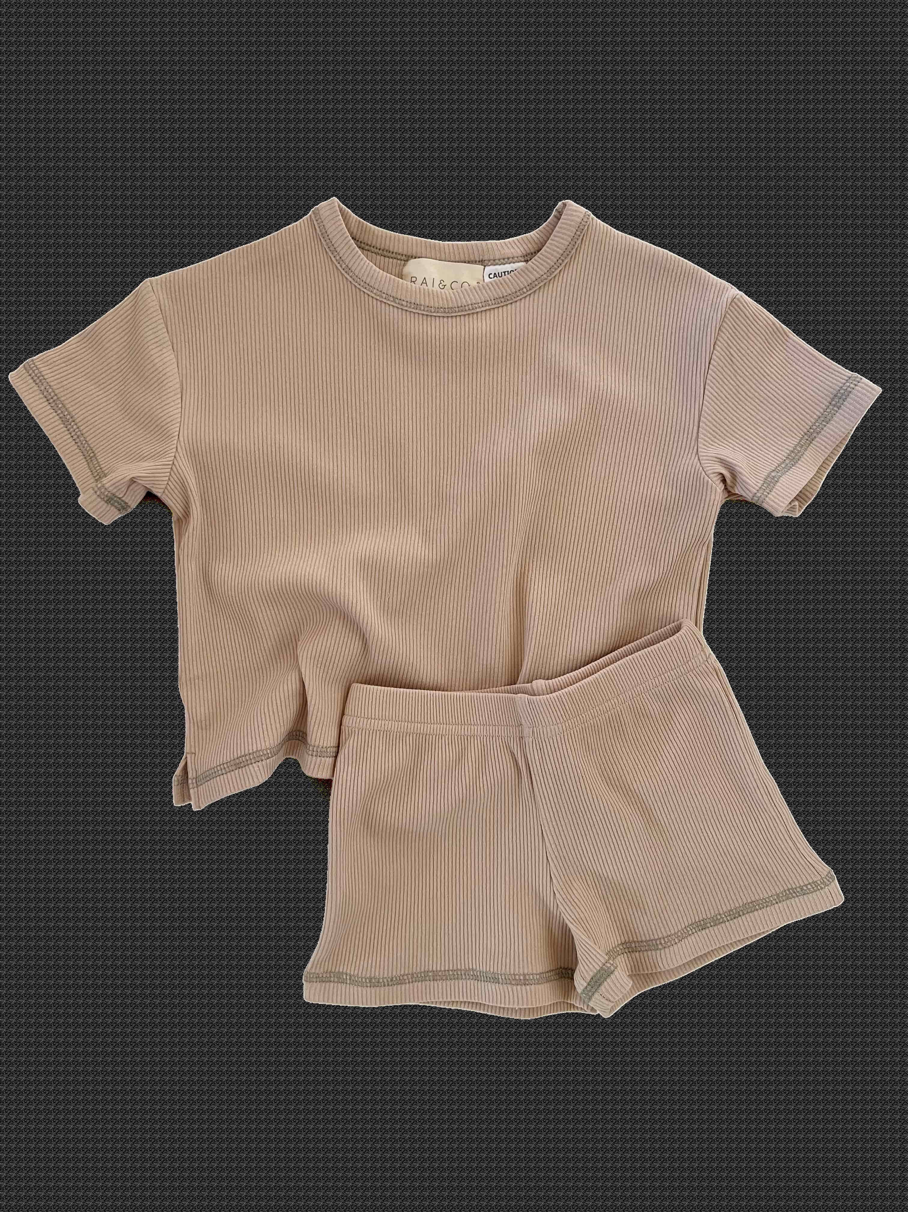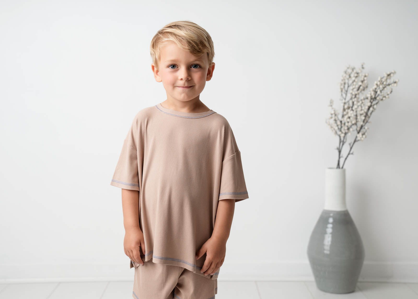 Summer is coming and we can’t wait for you to fall in love with our newest arrival. Super light weight mini ribbed T-shirt pyjama sets. Match your minis with our matching or sets and . Available in Beige and Blue with contrast stitching.