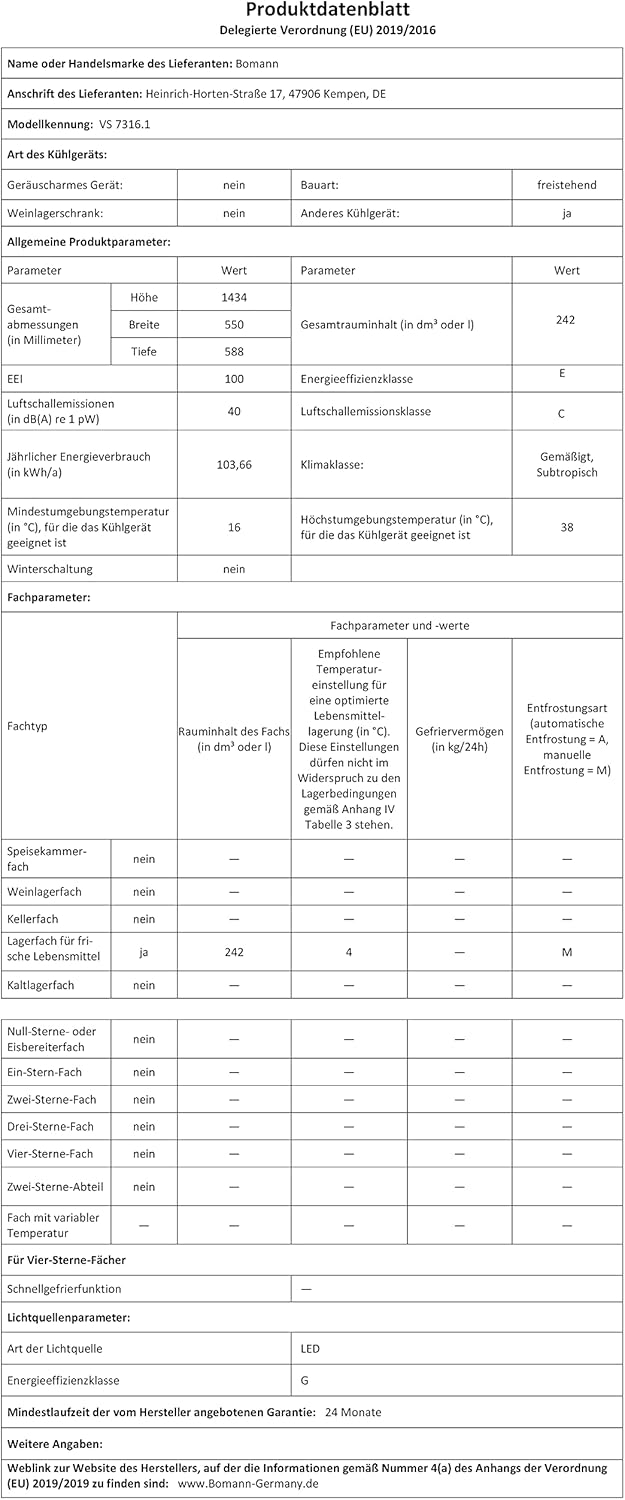 The VS 7316.1 from Bomann has a net capacity of 242 litres. The device has five glass shelves as well as four door shelves, a transparent vegetable tray and an egg tray