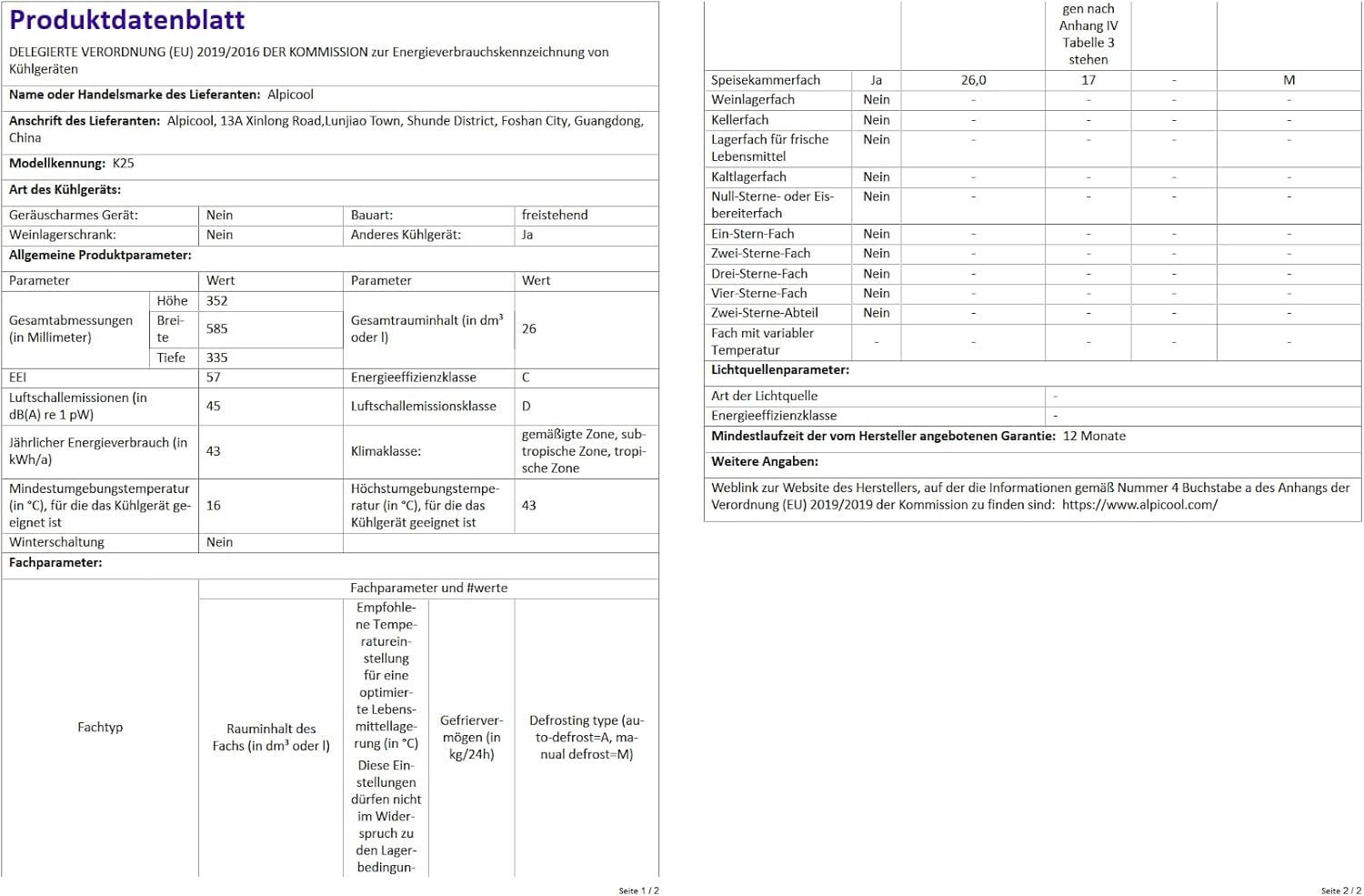 Temperaturbereich: Bis zu -20 °C