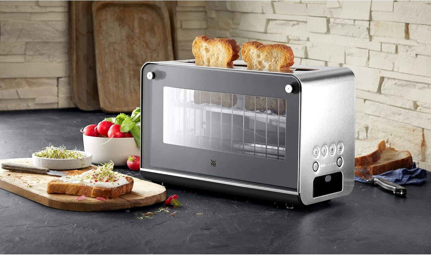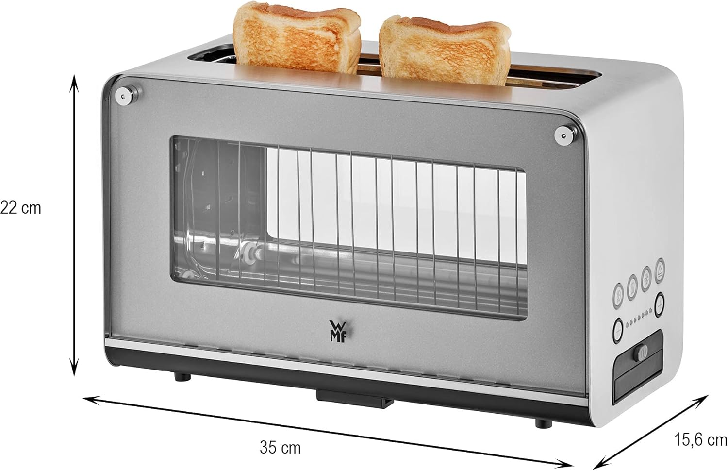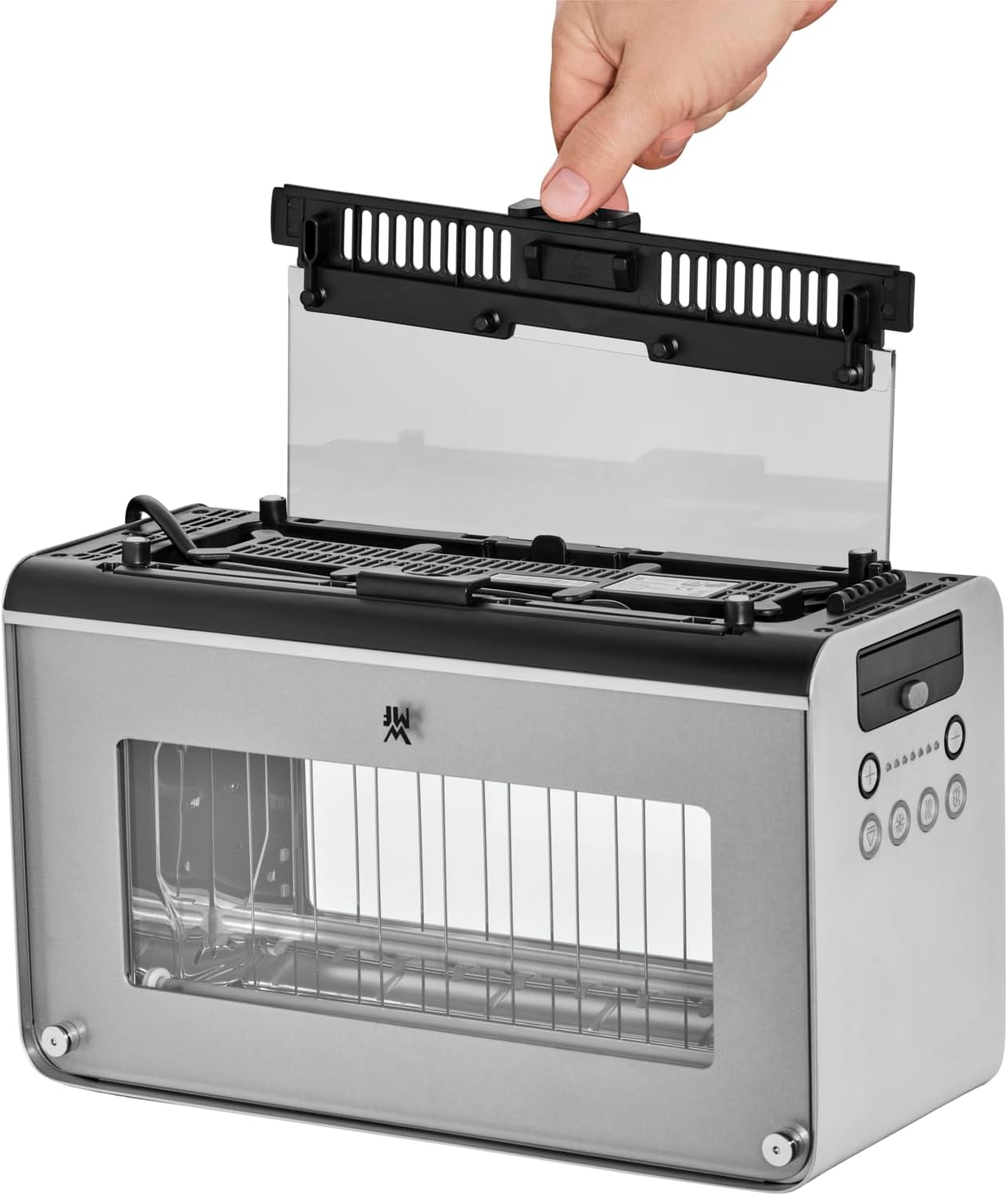 WMF Lono Toaster Glas mit Brtchenaufsatz, 2 Scheiben, XXL, motorisierte Toastaufnahme, Aufwrm-Funktion, 7 Brunungsstufen, Toaster edelstahl matt