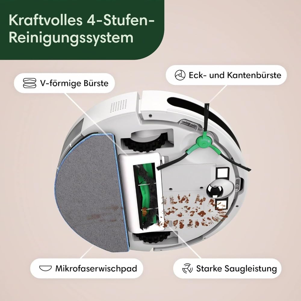 4-Stufen-Reinigungssystem: Der Roomba Combo Essential sorgt für eine gründliche Reinigung in vier verschiedenen Phasen – vom Saugen über Wischen bis zur Trockenreinigung.