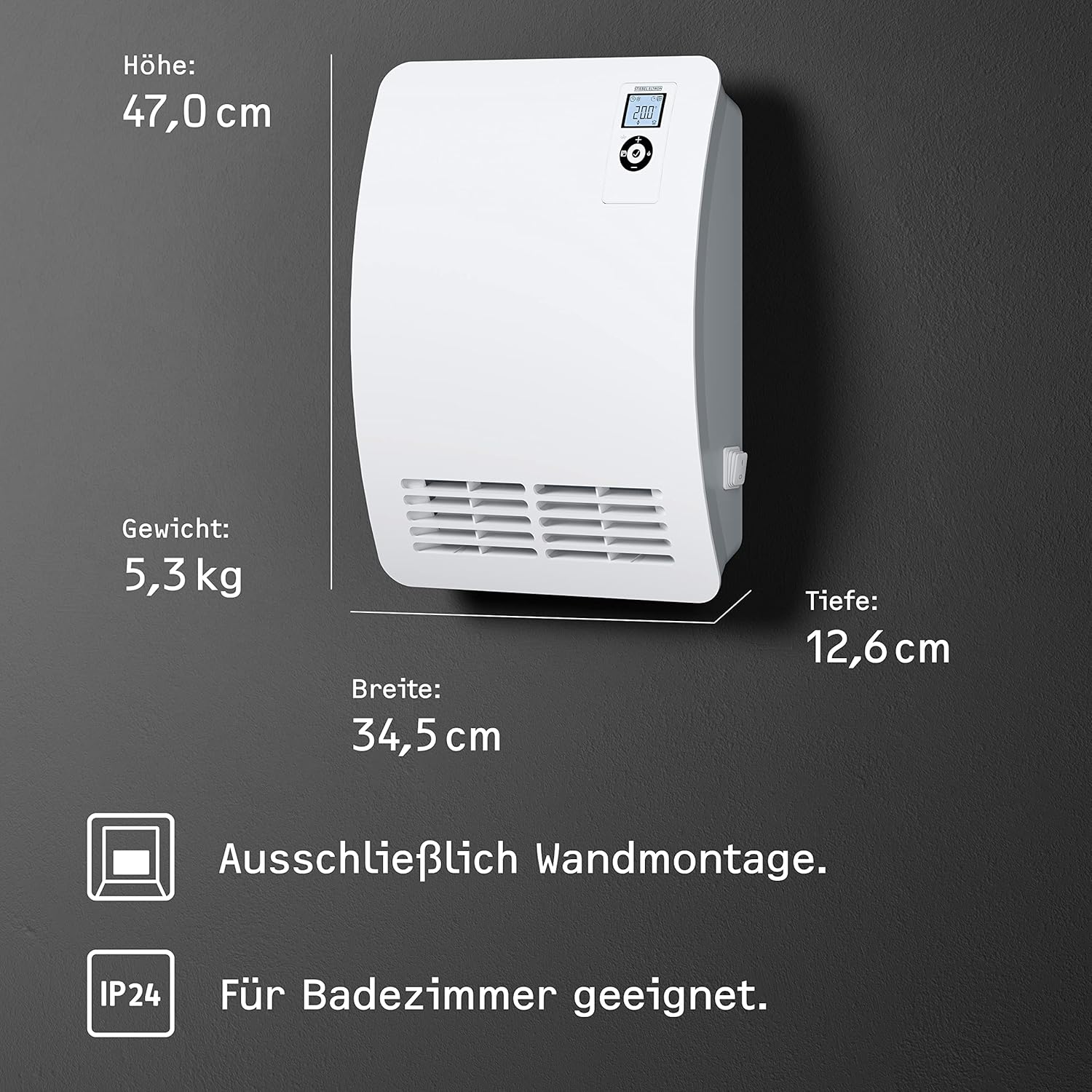 INSTALLATION: Einfache und stabile Wandmontage durch nur eine Person. Die elektrische Anschlussleitung der Heizung verfügt serienmig über einen Winkelstecker.
