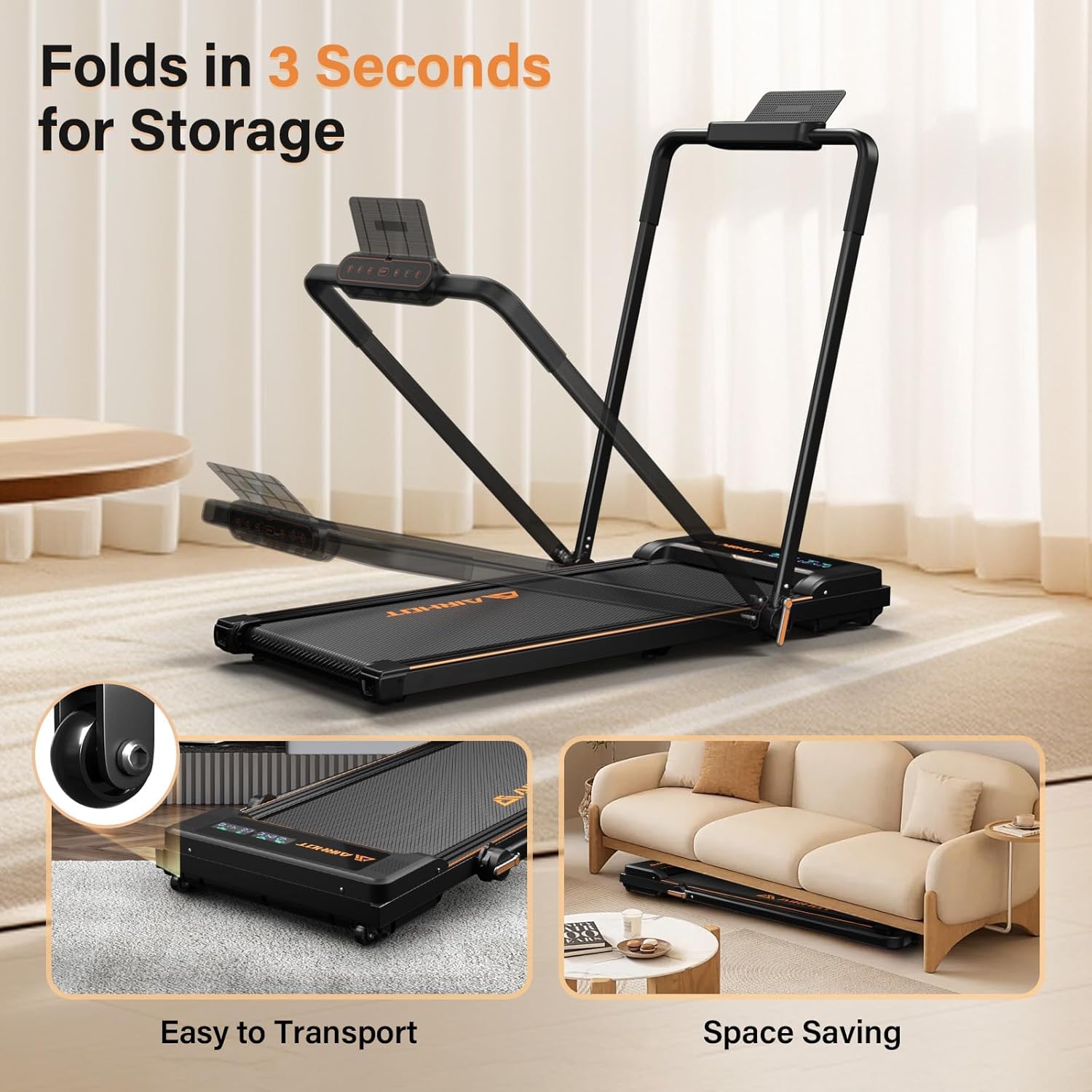 【Montagefreies Design】 Sparen Sie Platz und Zeit mit dem montagefreien Design und dem kompakten, faltbaren Design, das die Aufbewahrung und den Transport des AIRHOT 2-in-1-Klapplaufbands erleichtert. Dieses Laufband eignet sich perfekt für den Einsatz zu Hause, in der Wohnung und im Büro. Es wird komplett montiert geliefert und kann direkt nach dem Auspacken verwendet werden.
