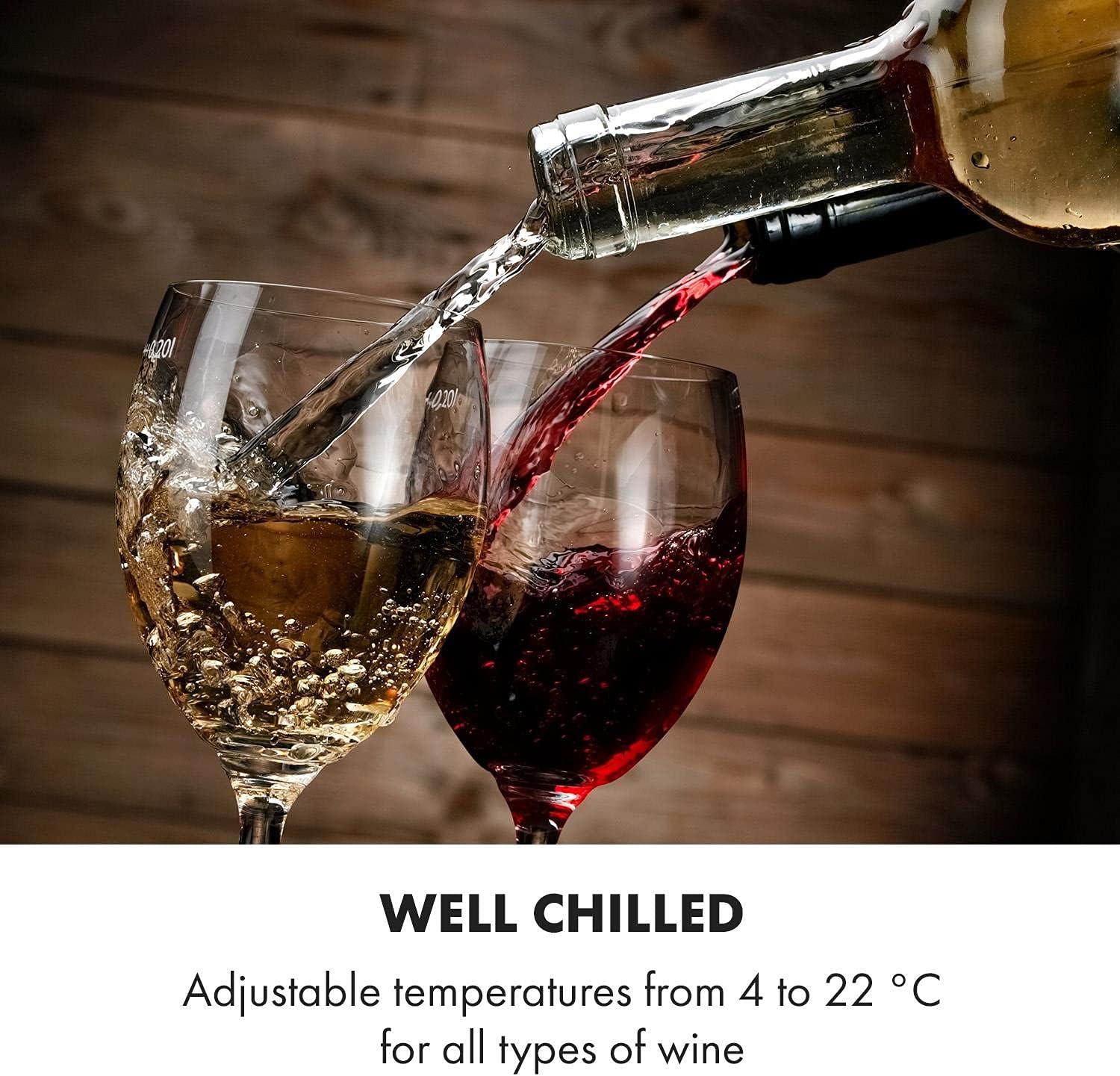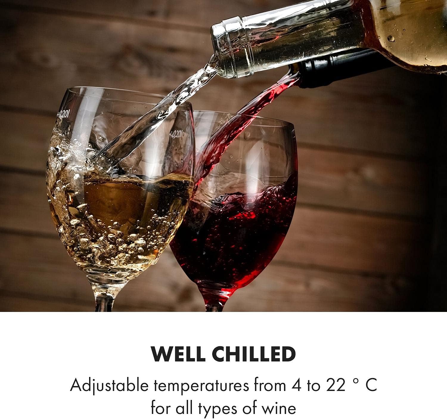 FÜR DIE RICHTIGE LAGERUNG DEINER WEINE: Die richtige Temperatur ist für Weine unerlässlich. Dieser Weinkühlschrank mit 1 Zone kann zwischen 4 °C und 22 °C eingestellt werden, um Rot- und Weißweine, Rosé, Prosecco und Bier richtig zu lagern.