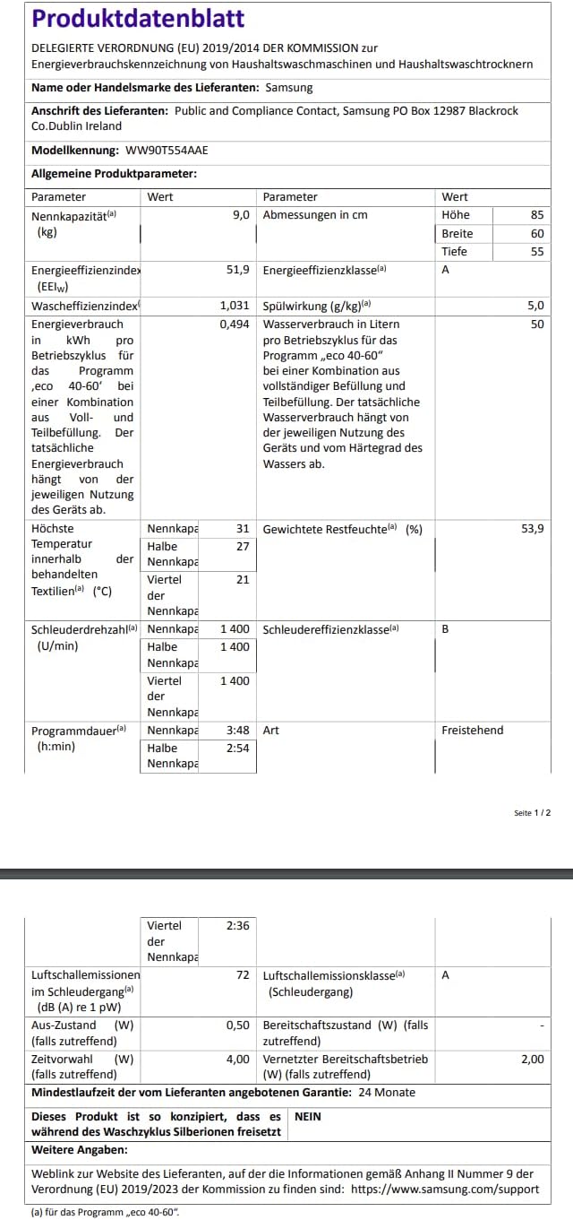 Samsung WW90T554AA Waschmaschine Frontlader 9 kg 1.400 U/Min, AddWash, Ecobubble, Hygiene Dampf, ECO5590 EEK: A