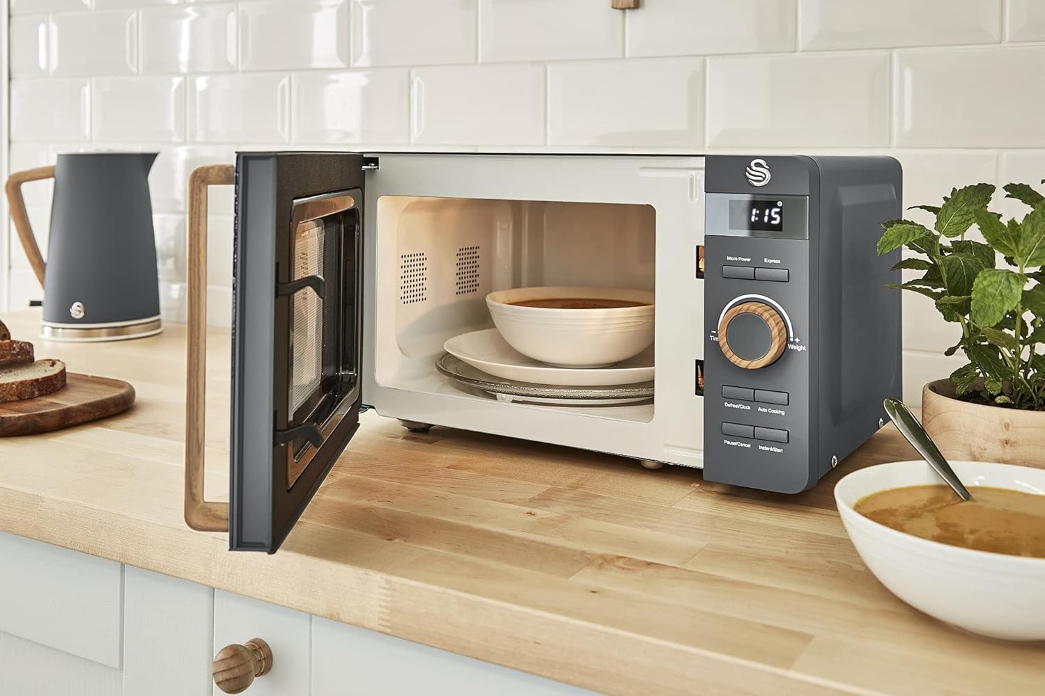 Stilvoll schlicht und funktional: Die skandinavisch inspirierte nordische digitale Mikrowelle von Swan mit mattem Gehäuse und weicher Haptik in einem sanften Baumwollweiß mit Griff- und Bedienelementen in Holzoptik ist eine schöne Ergänzung für jede Küche. Die perfekte moderne Mikrowelle für die minimalistische Küche, die jedem Zuhause einen Hauch von skandinavischem Stil verleiht.