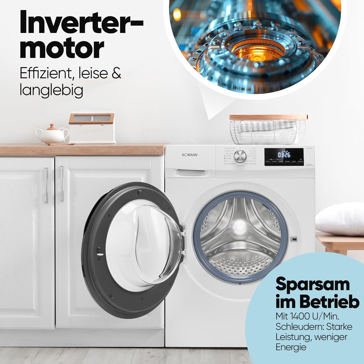 Effizienter, leiser und langlebiger Invertermotor, sparsam im Betrieb - max. 1400 U/Min. schleudern