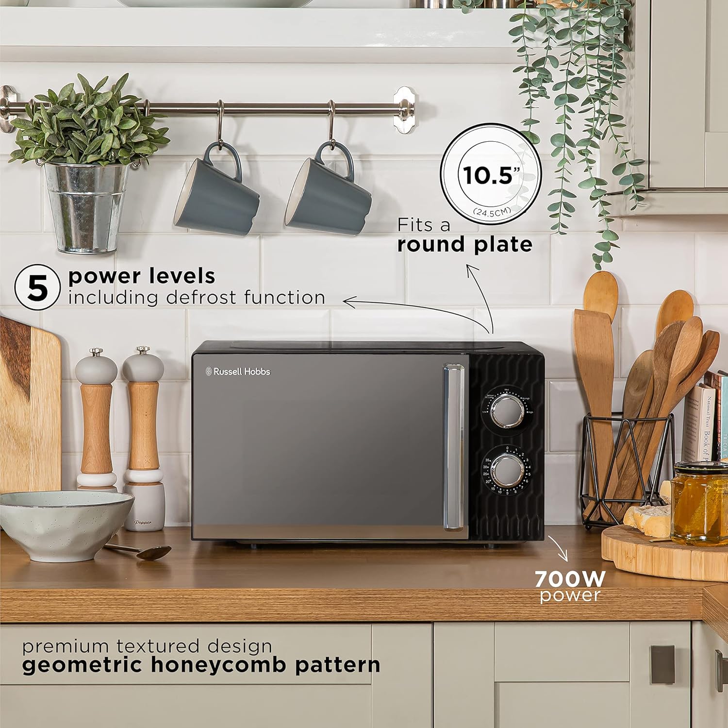 Russell Hobbs Honeycomb RHMM715G 17 Liter 700 W Grau Solo manuelle Mikrowelle mit 5 Leistungsstufen, integrierter Timer und Auftaufunktion