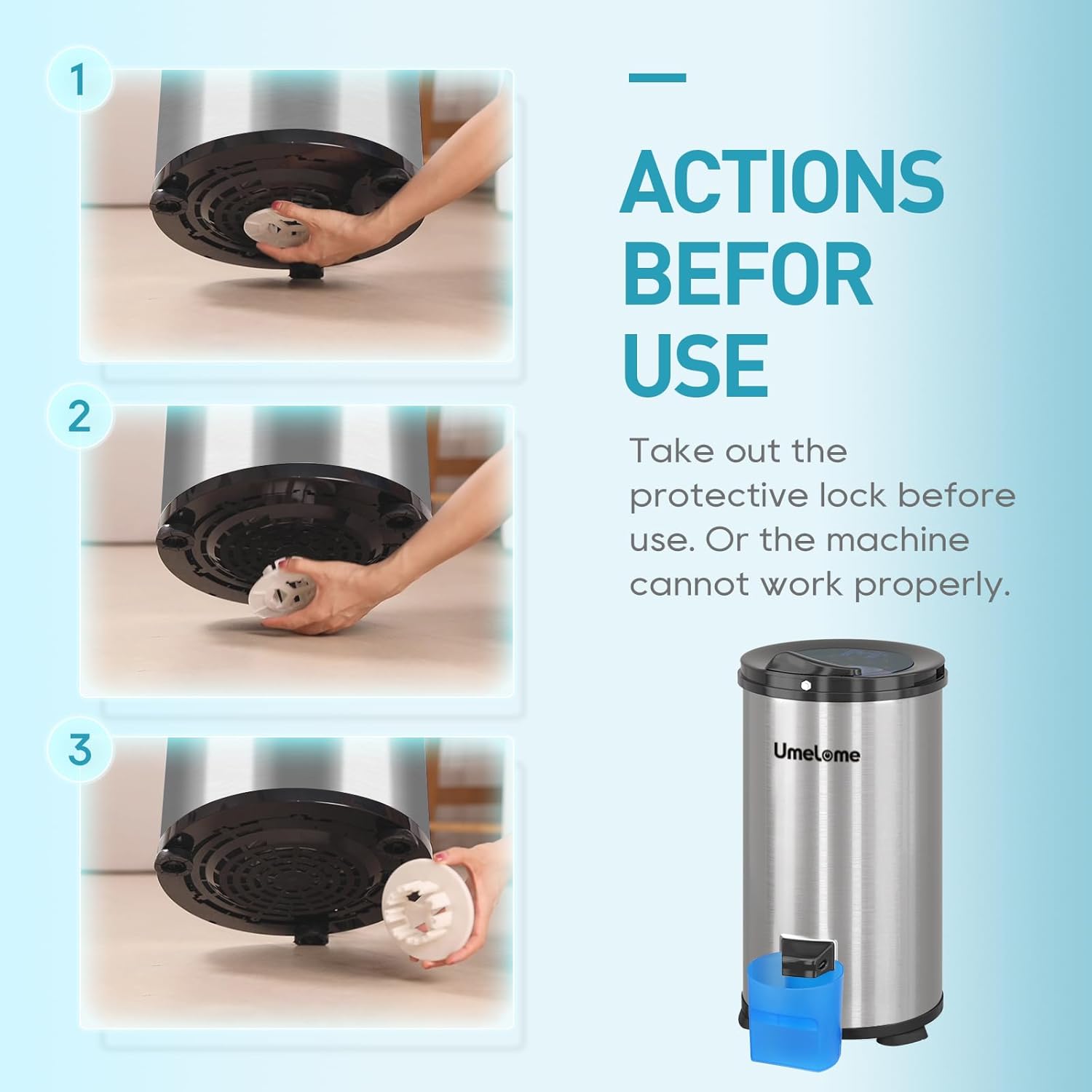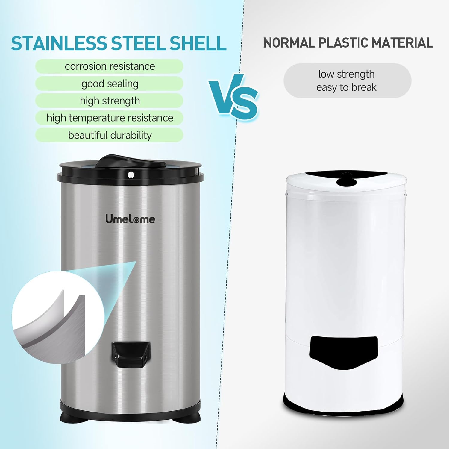 Sicherheitsmaterial: Der Umelome-Wäscheschleuder verwendet Edelstahl für die Schüssel, wodurch das Risiko einer möglichen Explosion durch die rotierende Innentrommel mit hoher Geschwindigkeit verringert wird. Es ist sicherer und stabiler im Vergleich zu dieser einfachen Materialscheel. Die Trommel verwendet auch hochwertigen Edelstahl, der eine längere Lebensdauer und keine Schäden an der Kleidung gewährleistet.