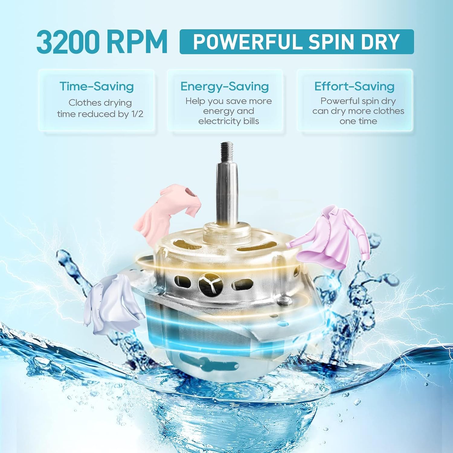 Hohe Entwässerungsrate: Die ultrahohe Rotationsgeschwindigkeit von 3200 U / min kann eine Zentrifugalkraft erzeugen, die 2-3 Minuten benötigt, um überschüssiges Wasser von der gewaschenen Kleidung zu entfernen und die Wäsche fast trocken zu machen, ohne Waschmittelspuren zu hinterlassen. Die Entwässerungsrate kann 95% erreichen, Zeit- und Energieeinsparung.