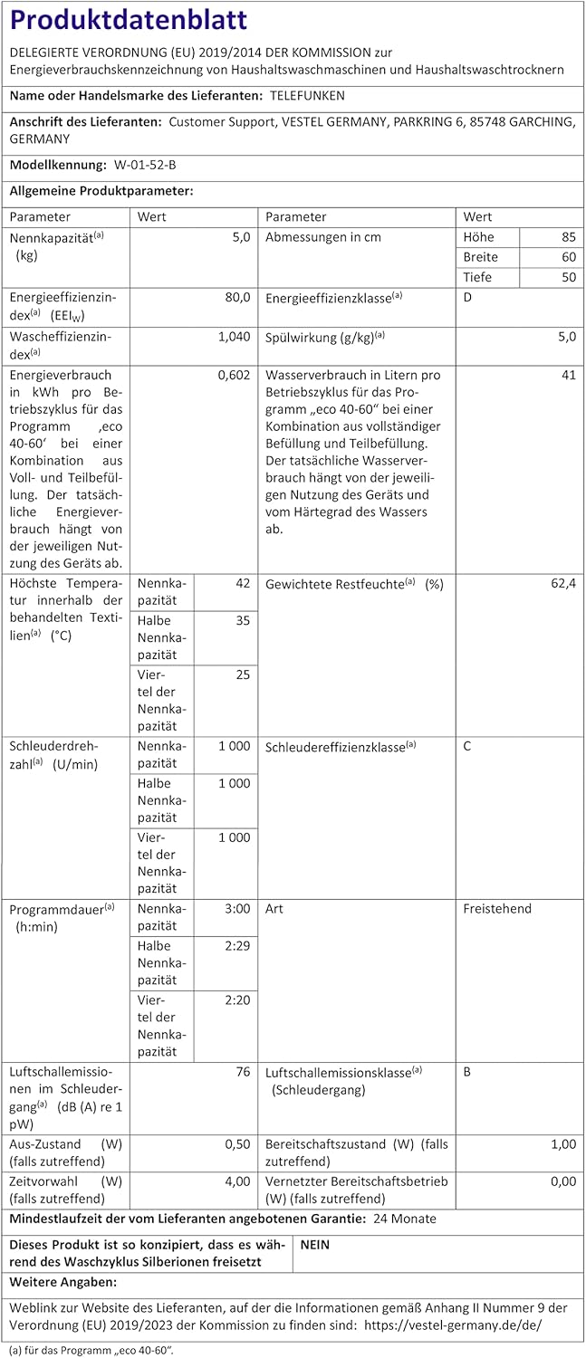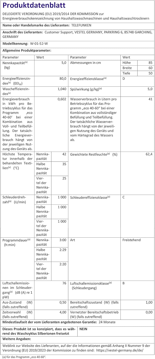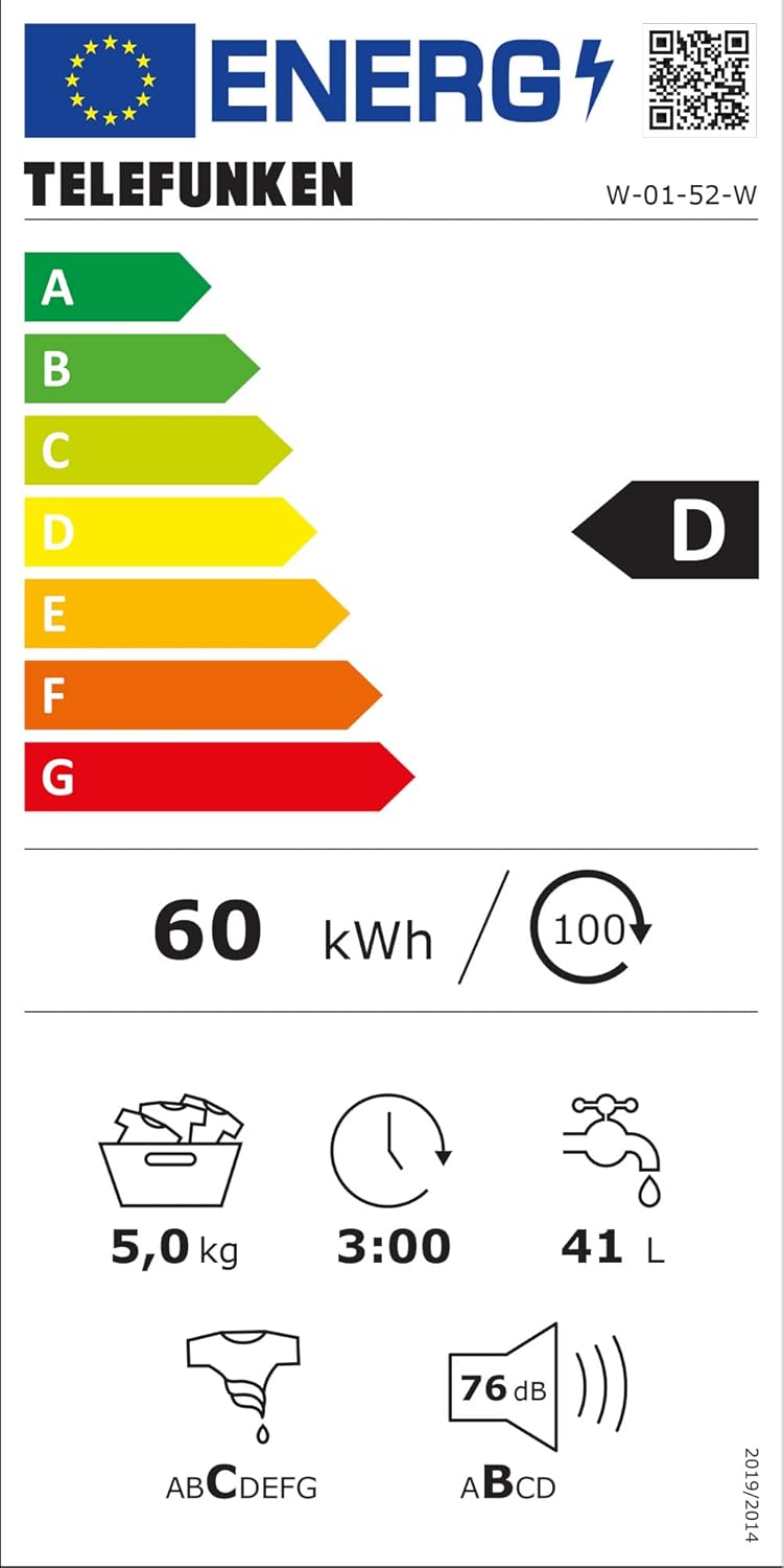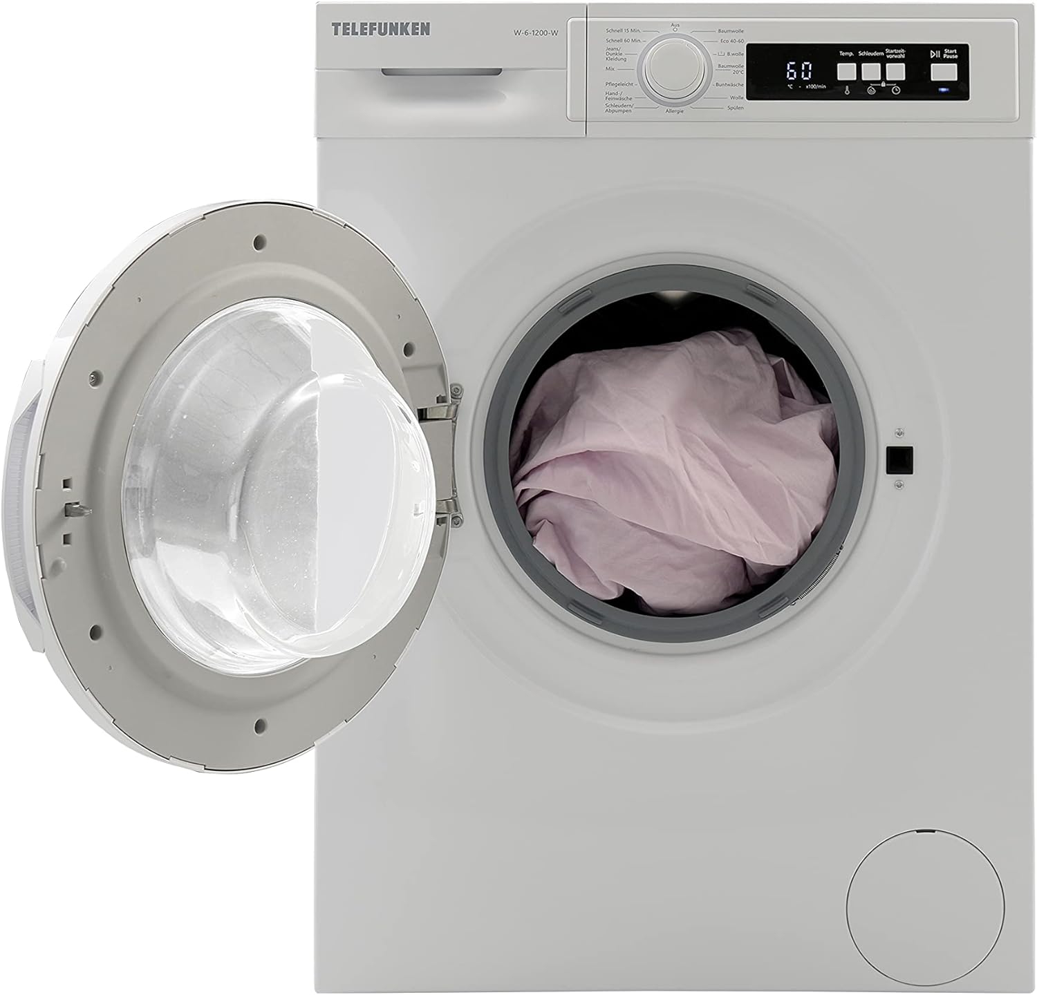 Telefunken W-01-52-W Waschmaschine (5 kg / 1000 U/Min) mit Mengenautomatik und Überlaufschutz / 15 Programme/Startzeitvorwahl/weiß