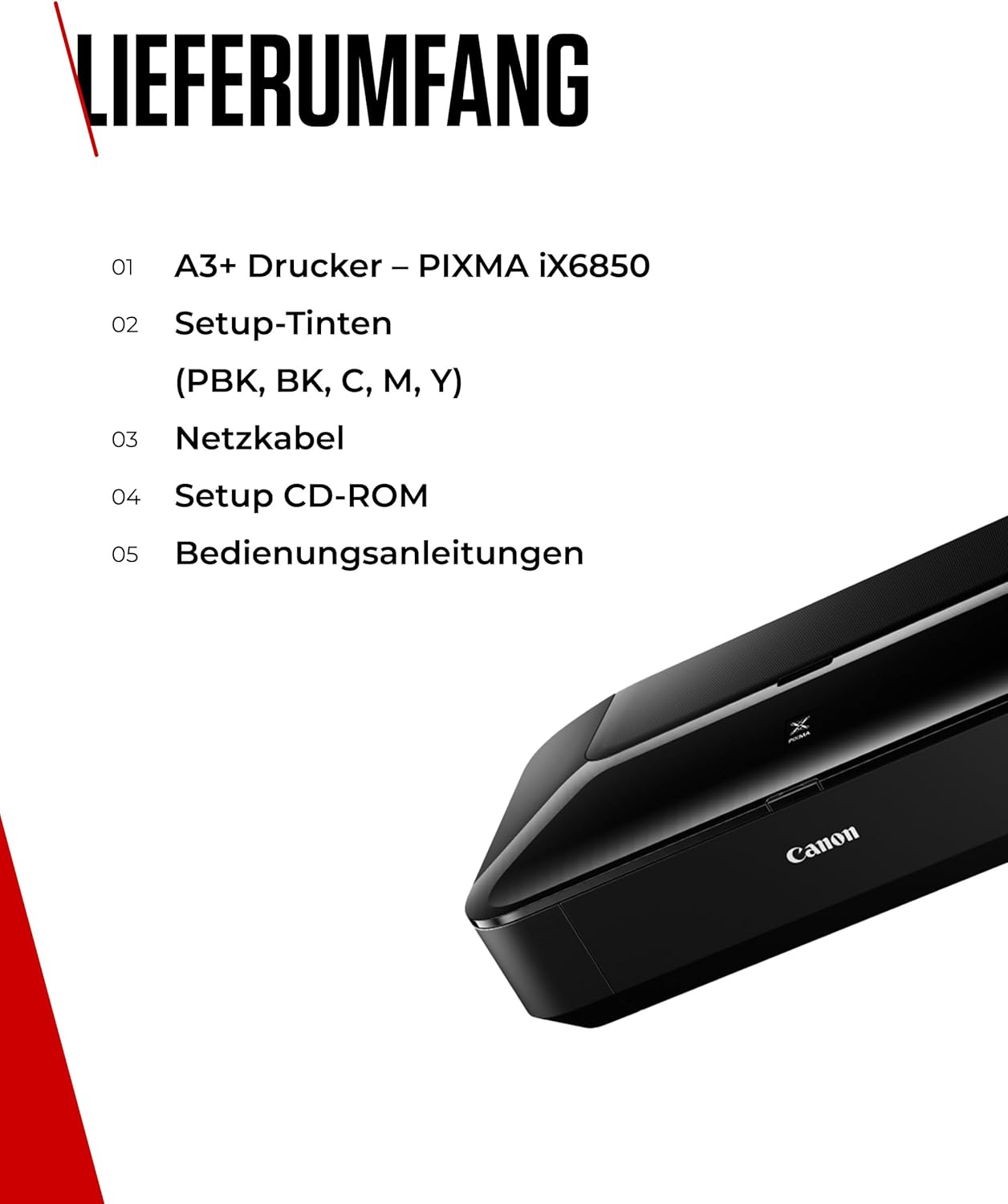 - A3+ Drucker – PIXMA iX6850;5 Standard-Tintentanks;Netzkabel;Setup CD-ROM;Kurzanleitungen und andere Dokumentationen