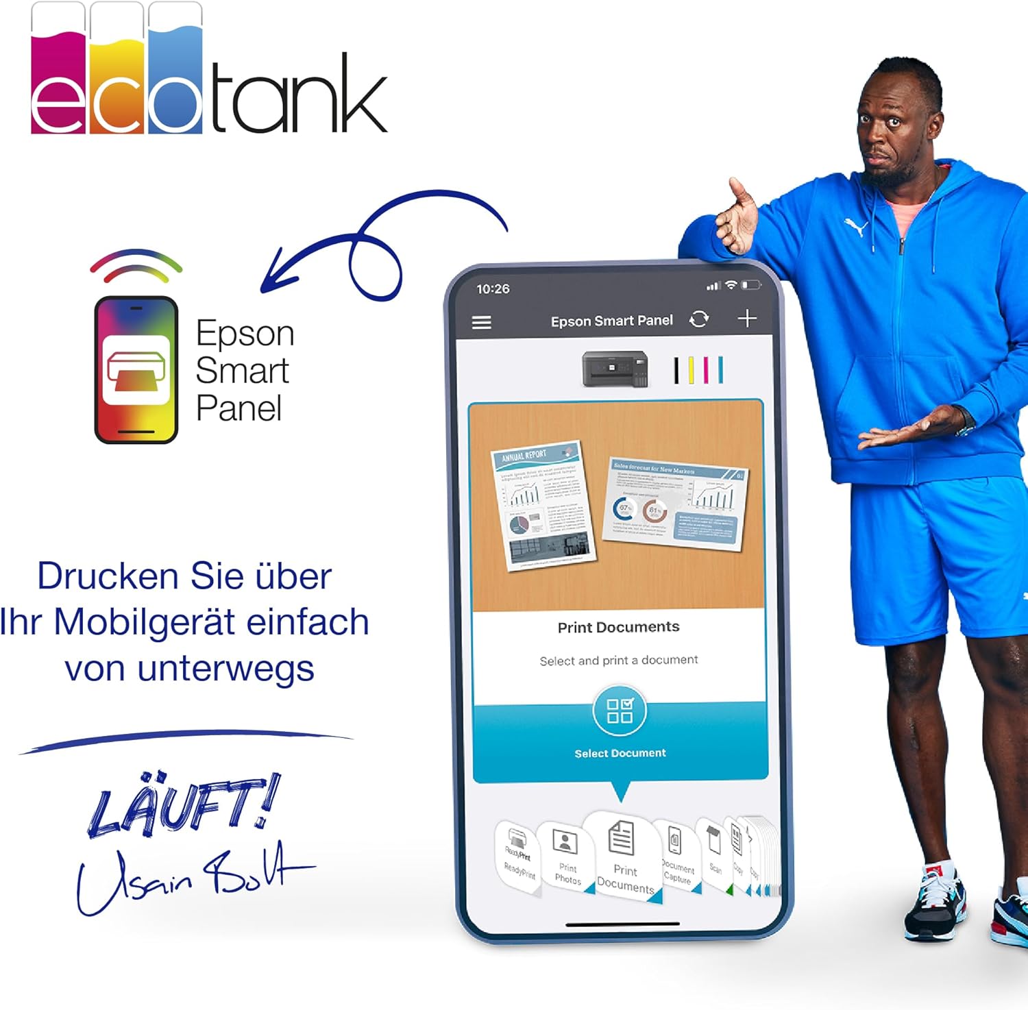Epson Smart Panel-App - Mit dieser App können Sie Ihren Drucker über Ihr Smart-Gerät bedienen* - Sie können Dokumente und Fotos drucken, kopieren und scannen, den Drucker einrichten und steuern sowie Fehler beheben – alles über Ihr Handy oder Tablet.