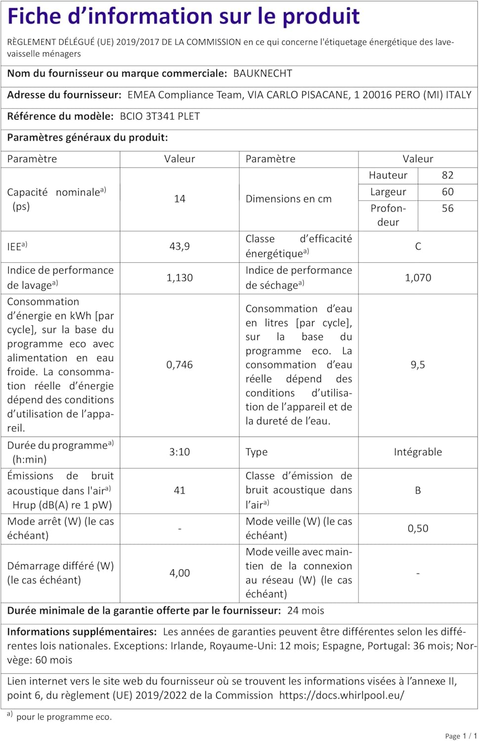 Bauknecht BCIO 3T341 PLET Vollintegrierbarer Geschirrspüler 60 cm /Edelstahl/14 Maßgedecke/10 Standardprogramme und 1 Sensorprogramm/PowerClean/ActiveDry/Besteckschublade/Vollwasserschutz