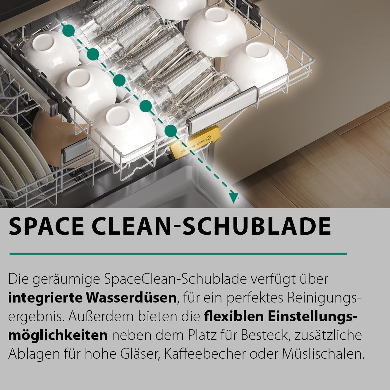 PRO COMFORT-BESTECKSCHUBLADE - Mit der praktischen, flexibel teilbaren ProComfort-Besteckschublade haben Sie noch mehr Flexibilität, Platz und Ordnung in Ihrem Geschirrspüler. Durch ihre flexible Einstellung bietet die Besteckschublade zusätzlichen Raum für höhere Gefäße oder langstilige Gläser. Die Schublade ist leicht verstellbar und damit bei Bedarf auch für längere Messer, Kochlöffel oder Küchenutensilien ausgelegt.