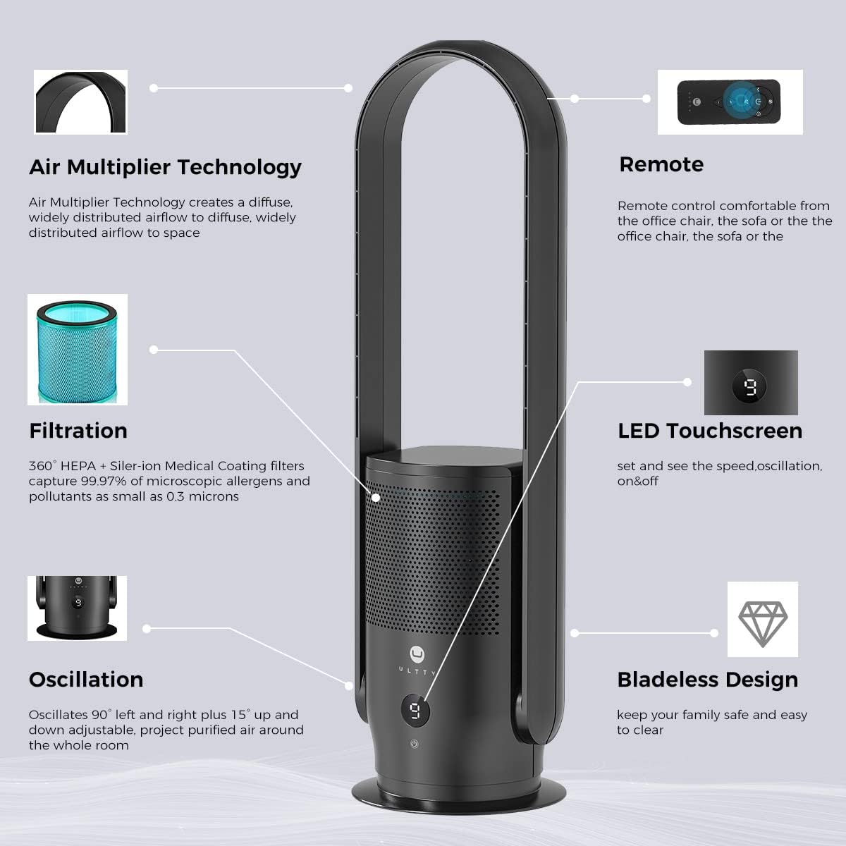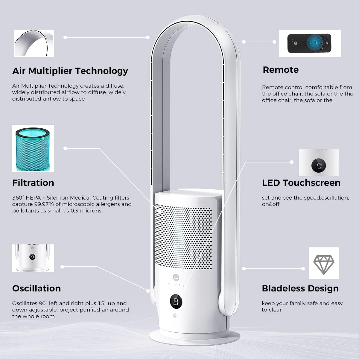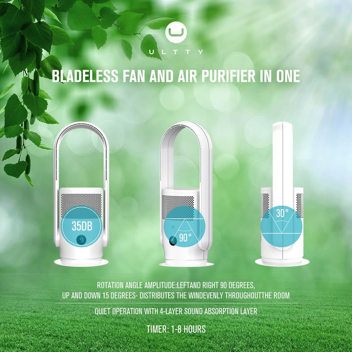 Rotorloser Ventilator mit Luftreiniger, Ultty Turmventilator Leise mit Fernbedienung, Touch, 8H Timer, HEPA-Filter 99,97%, 80cm 90° Oszillation Bladeless Fan für Schlafzimmer Heim, CR022 Weiß
