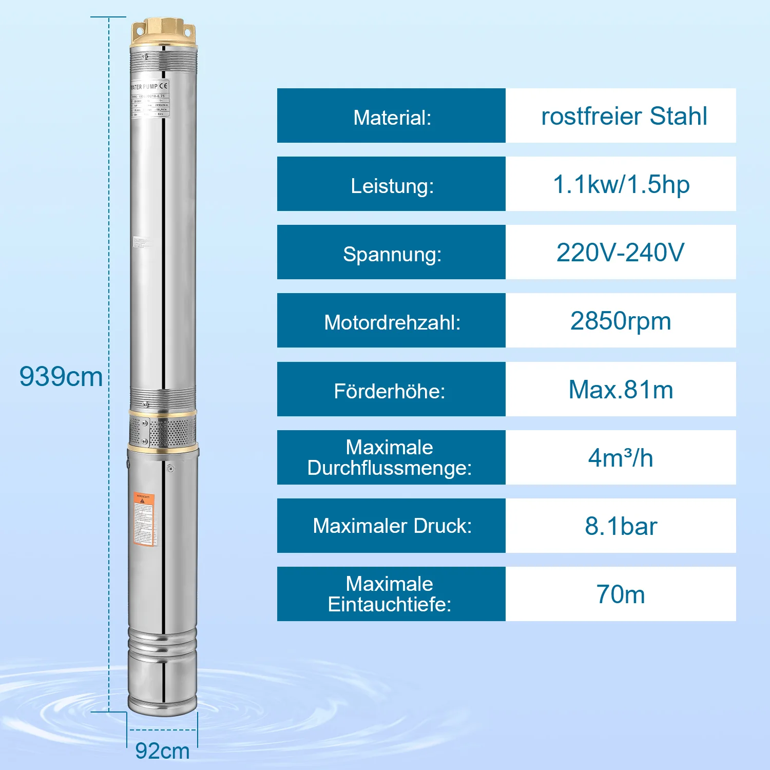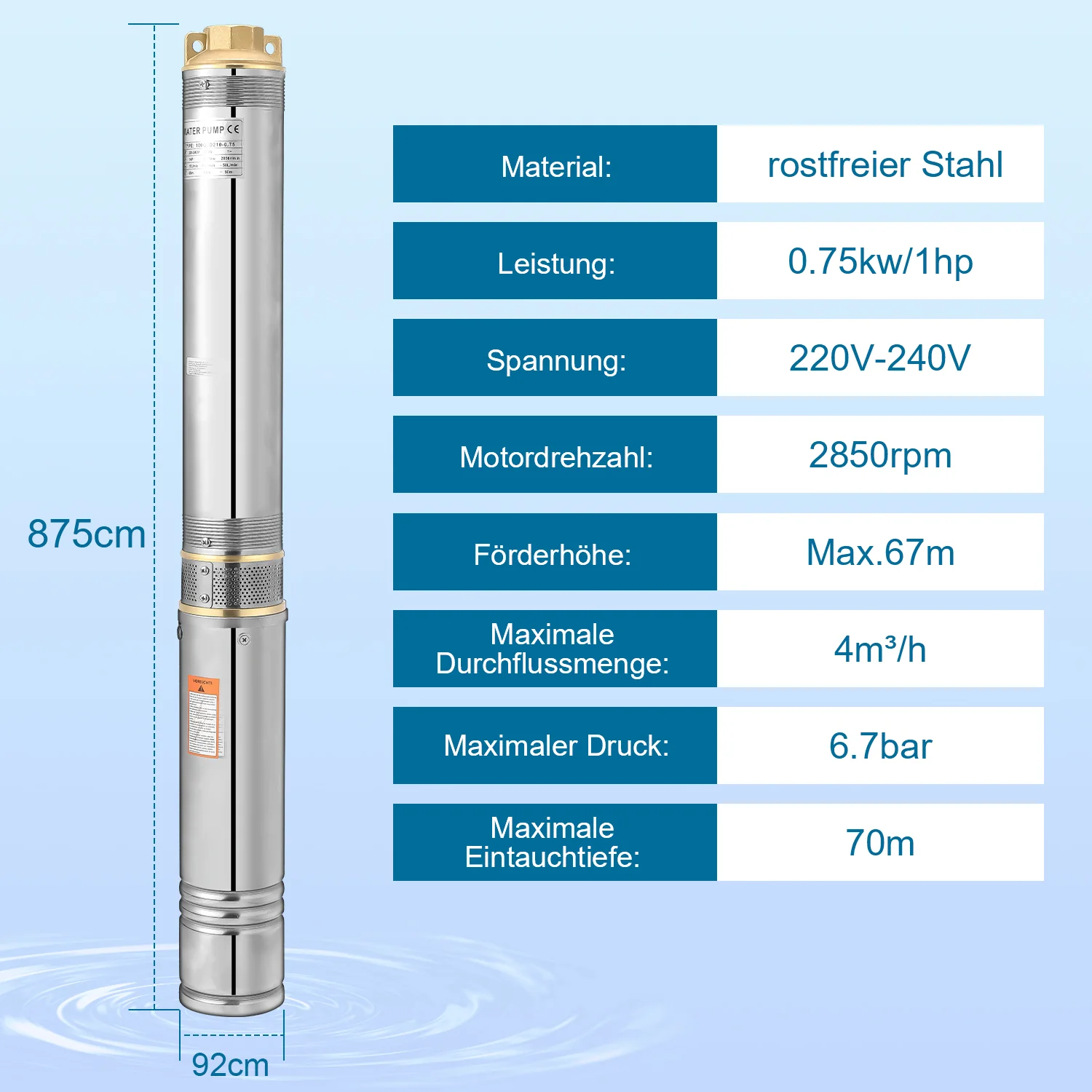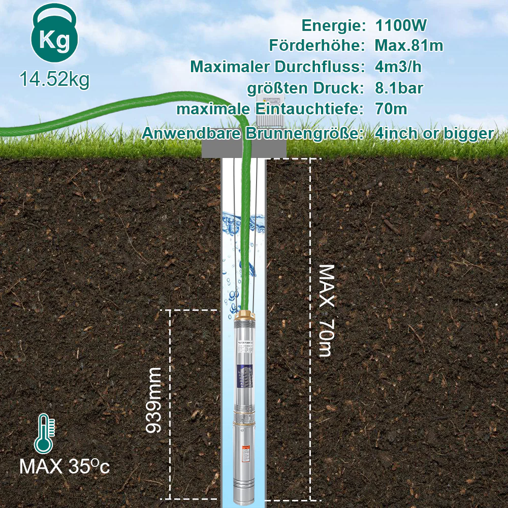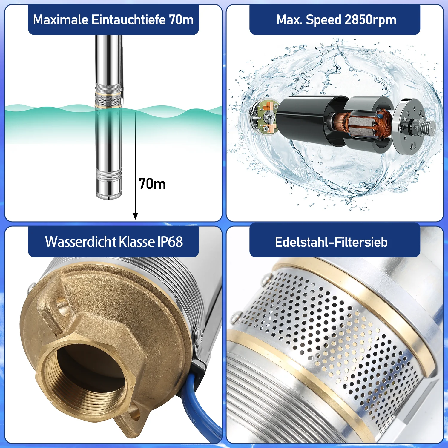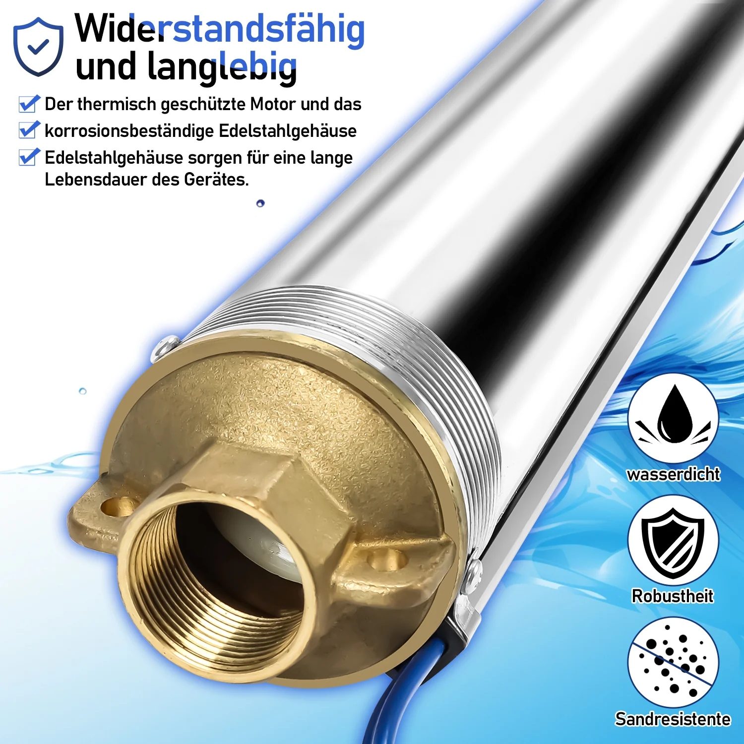 【Hchst Effiziente 】Tiefbrunnenpumpen sind hchst effiziente Tauchdruckpumpen. Sie ist mit 20m Anschlusskabel ausgestattet und ideal für den Einsatz in schmalen Brunnen, Schchten und Zisternen.