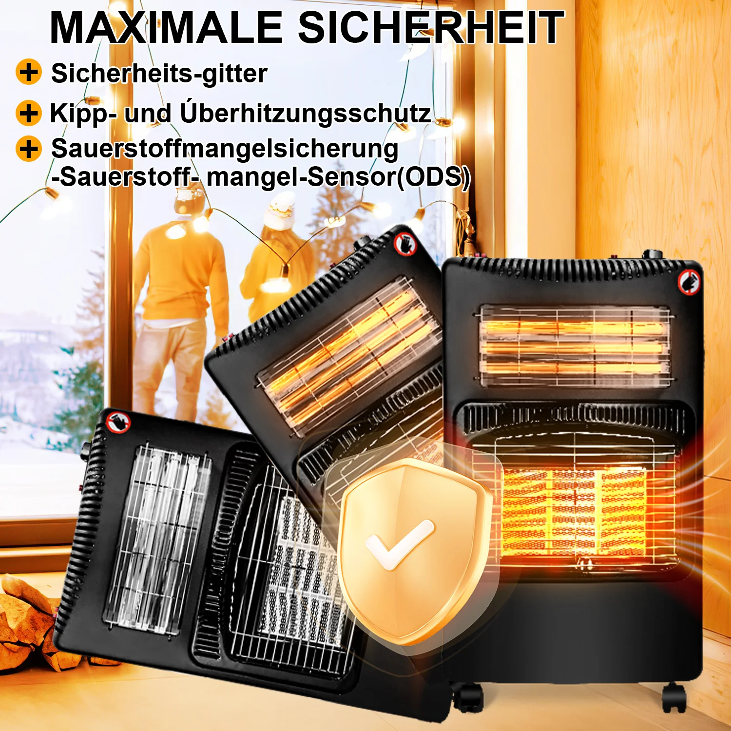 Dreifaches Sicherheitsdesign: Der elektrische Gasheizer ist mit Kippschutz, Sauerstoffmangelschutz (ODS) und Flammenausfallschutz (FFD) ausgestattet. Wenn der elektrische Gasheizer versehentlich umfllt oder einen Sauerstoffmangel in der Umgebung feststellt, schaltet er sich automatisch ab, um die Sicherheit whrend des Gebrauchs zu gewhrleisten.