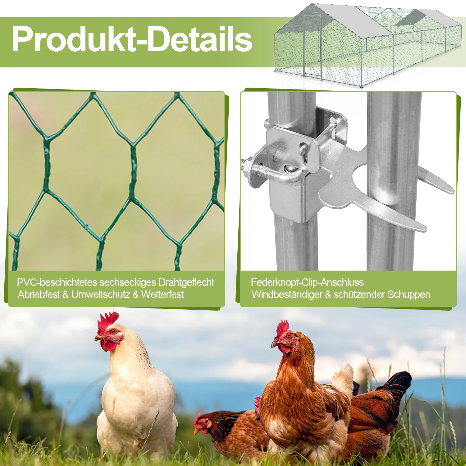 【Sicherheit】Unser Hühnerstall ist mit einer Türverriegelung und einer ausreichend langen PVC-beschichteten Sechskantmaschendraht ausgestattet, um ein Entkommen von Haustieren und Geflügel zu verhindern und zustzliche Sicherheit zu bieten. Mit dem mitgelieferten Bodenrahmen und Erdngeln kann er stabil auf dem Boden stehen und vor ueren Strungen geschützt werden.