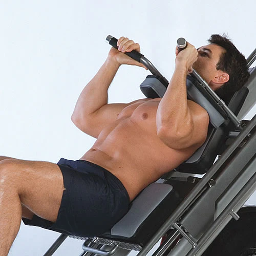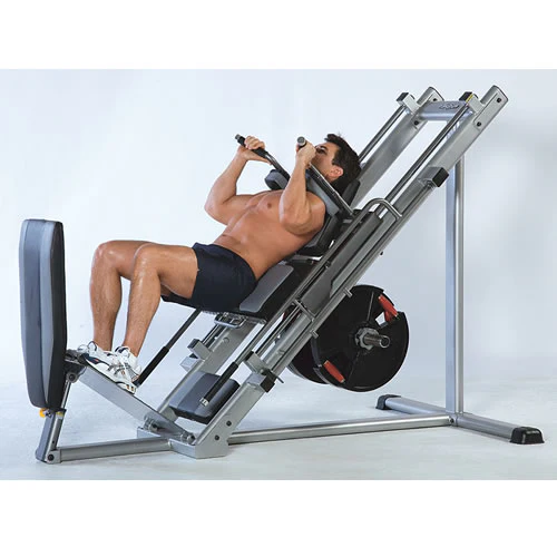 Die dualfunktionale Beinpresse RPL-200 von Tuff Stuff verfügt über eine Klappfunktion der Griff-, Polster- und Standflchen. Die RPL-200 kann als Standartbeinpresse mit einem 45° Winkel- Schlitten und als Schubbeinpresse (ebenfalls 45° Winkel) eingesetzt werden. Die Standartbeinpresse sieht das Wegdrücken des Gewichtsschlittens mit den Beinen vor, die Kraftübertragung erfolgt also über die Füe direkt auf den Schlitten. Die Kraftübertragung bei der Schubbeinpresse wird über die Schultern, welche gegen ein Polster fixiert sind durch das Strecken der Beine übertragen.