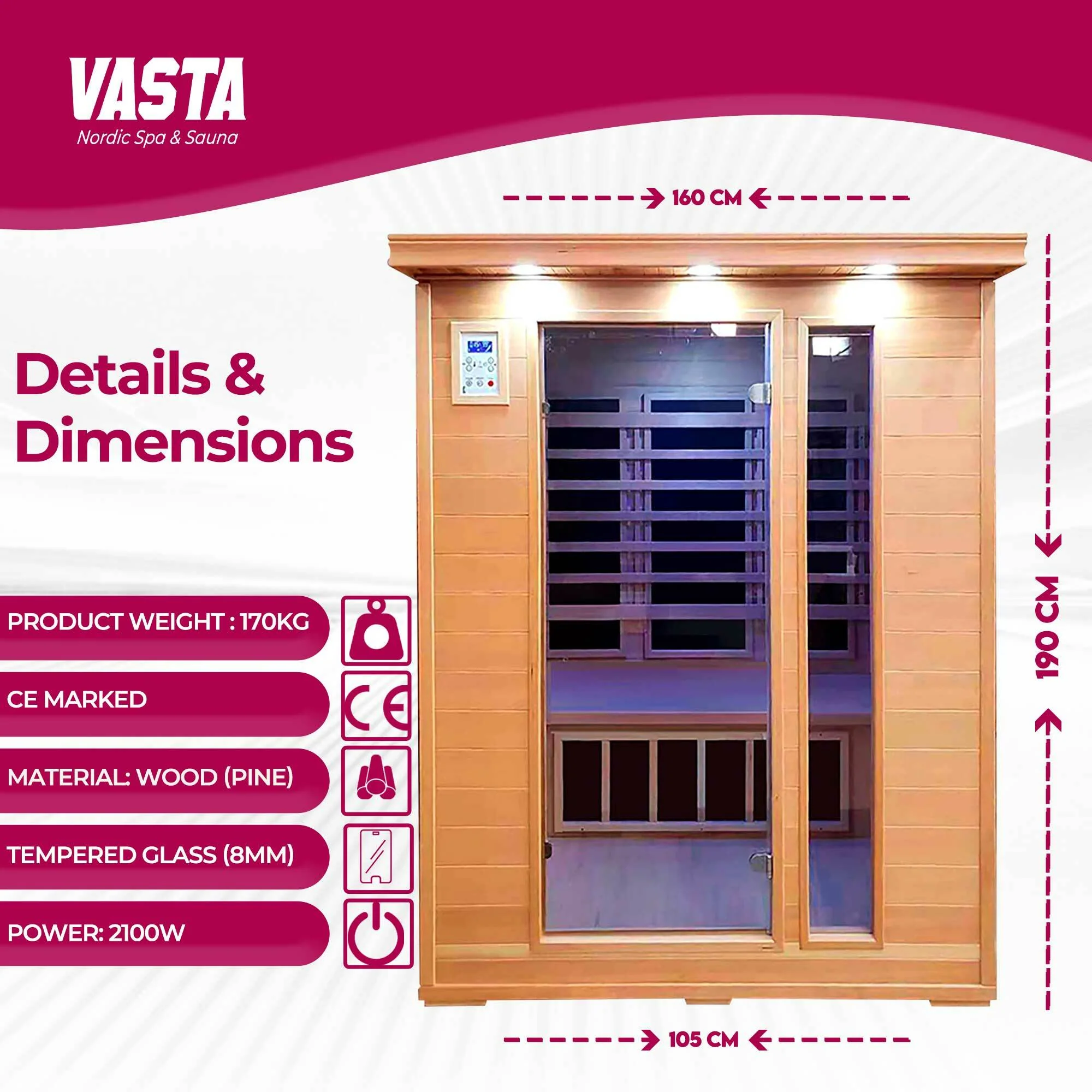 Das Entspannen in der stilvollen und komfortablen Vasta-Infrarotkabine ist ein angenehmes und gesundheitsfrderndes Erlebnis. Die von einer Infrarotwrmekabine erzeugte Wrme fühlt sich gut an, weil sie tief in den ganzen Krper eindringt und sowohl krperlich als auch geistig entspannt. Die Wrme ist gesund und hnelt der Wrme der Sonne. Die gesundheitlichen Vorteile von Infrarotkabinen sind erheblich und vielfltig, wie z. B. die Verbesserung der peripheren Durchblutung, die Strkung des Herz-Kreislauf-Systems, die Schmerzlinderung, die schnellere Genesung nach Verletzungen und die Erholung von krperlichen oder sportlichen Anstrengungen.